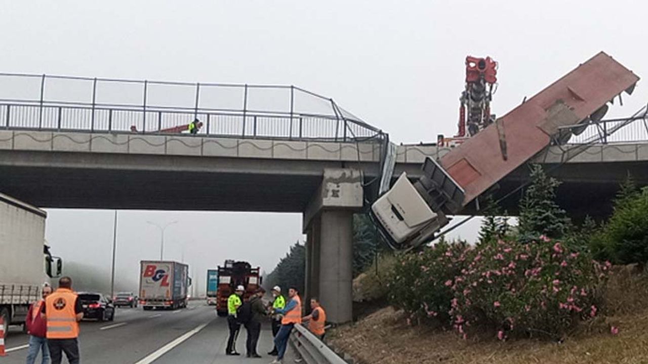 Kaza, saat 04.00 sıralarında Gebze Organize Sanayi Bölgeleri Kavşağı’nda meydana geldi. Kavşaktan dönüş yapan Ayhan Algı (41) yönetimindeki 41 YR 708 plakalı TIR, sürücüsünün kontrolünden çıkıp yol kenarındaki bariyerlere çarptı. Bariyerleri kıran TIR, altından TEM Otoyolu’nun geçtiği köprüde asılı kaldı. İhbar üzerine kaza yerine polis, itfaiye ve sağlık ekipleri sevk edildi. TIR'da sıkışan sürücü Algı, itfaiye ekipleri tarafından kurtarıldıktan sonra ambulansla Gebze Fatih Devlet Hastanesi'ne kaldırıldı.