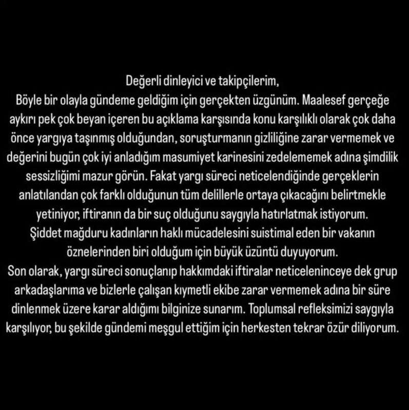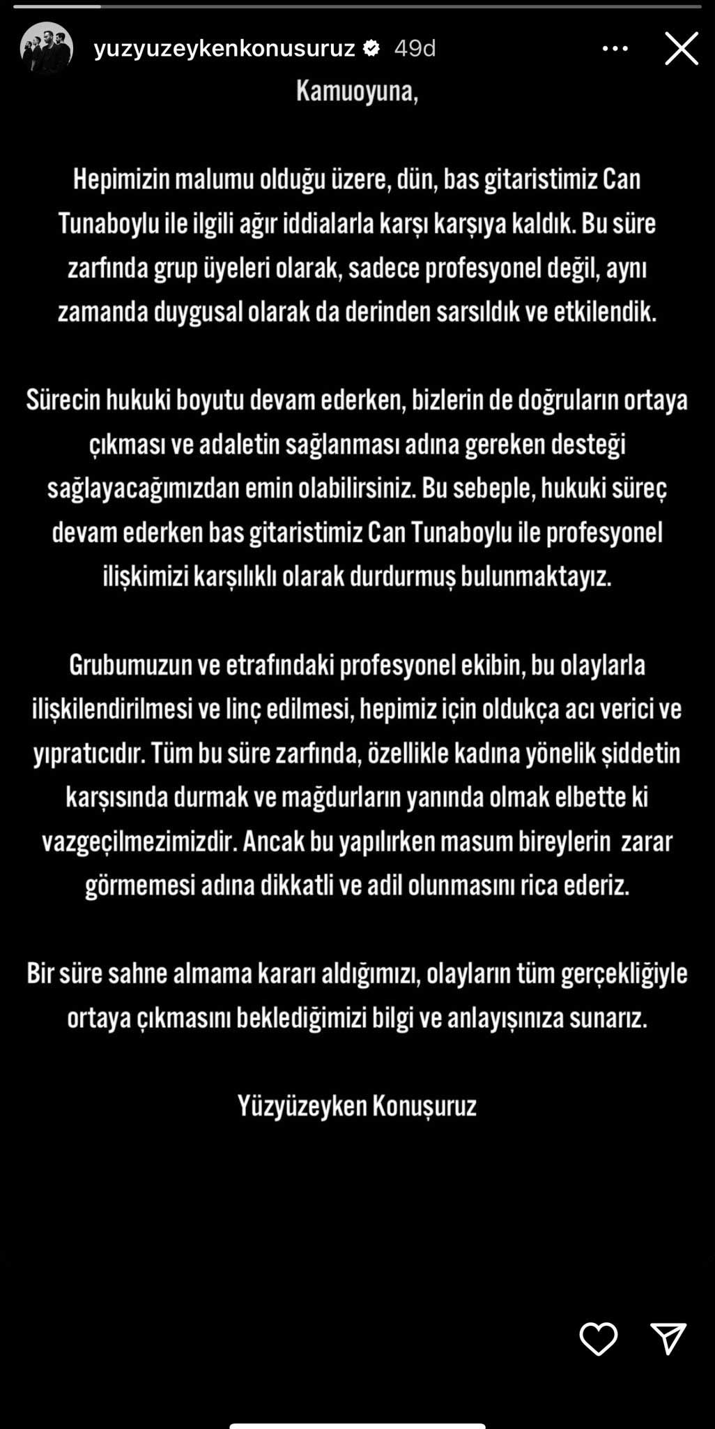 Yüzyüzeyken Konuşuruz grubu sosyal medya hesabından konuya ilişkin açıklamada bulundu. Açıklamadan bir süre sahne almayacakları vurgulanırken baş gitarist Can Tunaboylu ile olan profesyonel ilişkilerinin de durdurulduğu belirtildi.