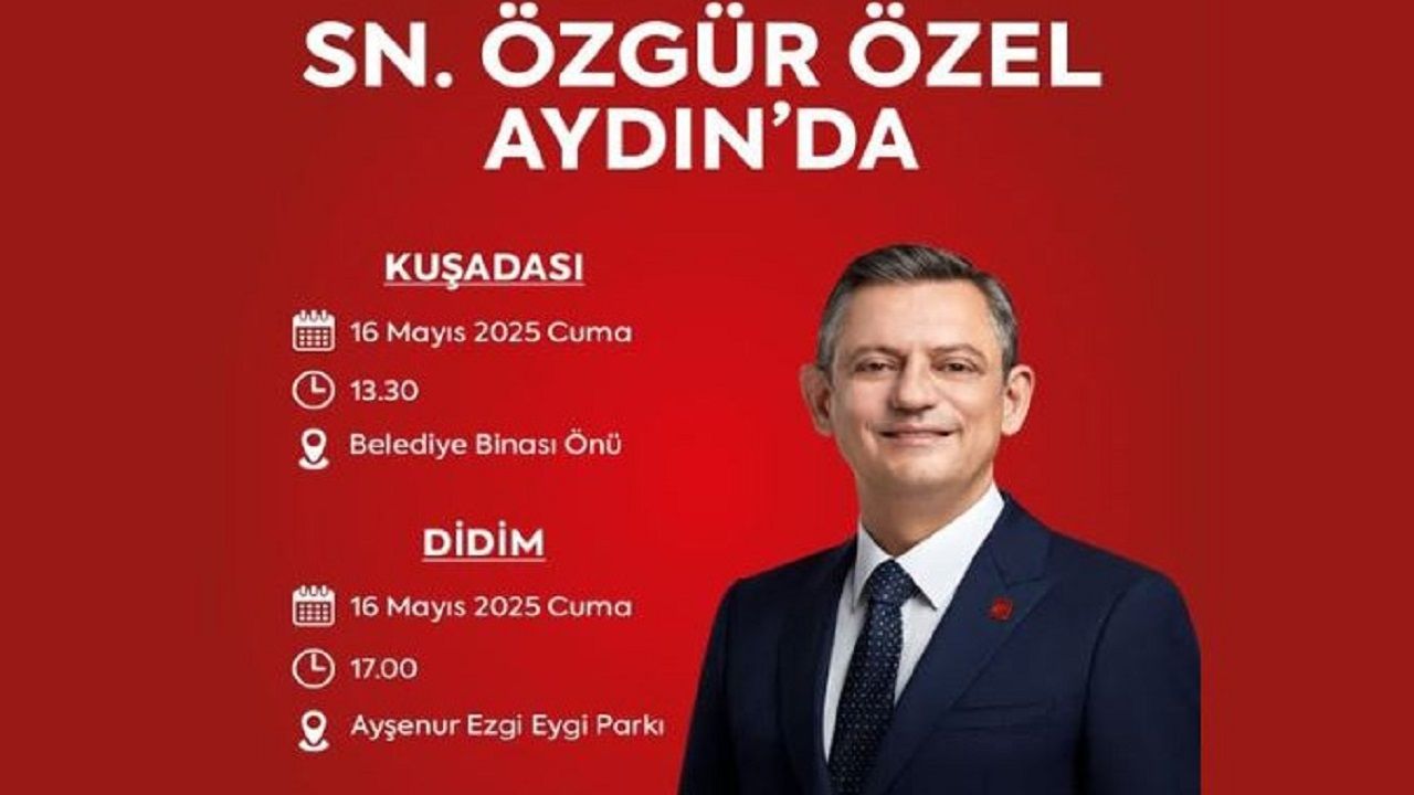 Cumhuriyet Halk Partisi Genel Başkanı Özgür Özel, 16 Mayıs Cuma günü bir dizi ziyaretlerde bulunmak ve açılış törenlerine katılmak için Aydın’da vatandaşlarla bir araya gelecek. Saat 13.30’da Kuşadası Belediyesi hizmet binası önünde, saat 17.00’de ise Didim’de Ayşenur Ezgi Eygi Parkı’nda halka seslenecek olan Özel, belediyelerin toplu açılış törenlerinde de kurdele kesecek.