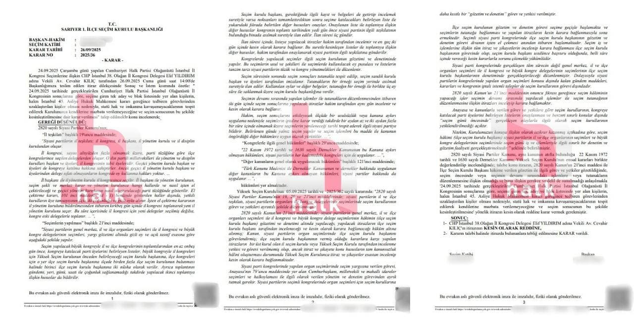 Ancak Sarıyer 1. İlçe Seçim Kurulu, yapılan itirazın seçim iş ve işlemleriyle ilgili olmadığını belirterek başvuruyu reddetti. Kararda, kurulun yalnızca seçim günü işlemleri ve tutanaklara ilişkin denetim yetkisi bulunduğu vurgulandı. Mahkeme kararlarının veya kongre dışı tartışmaların kurulun görev alanına girmediğine dikkat çekildi.
