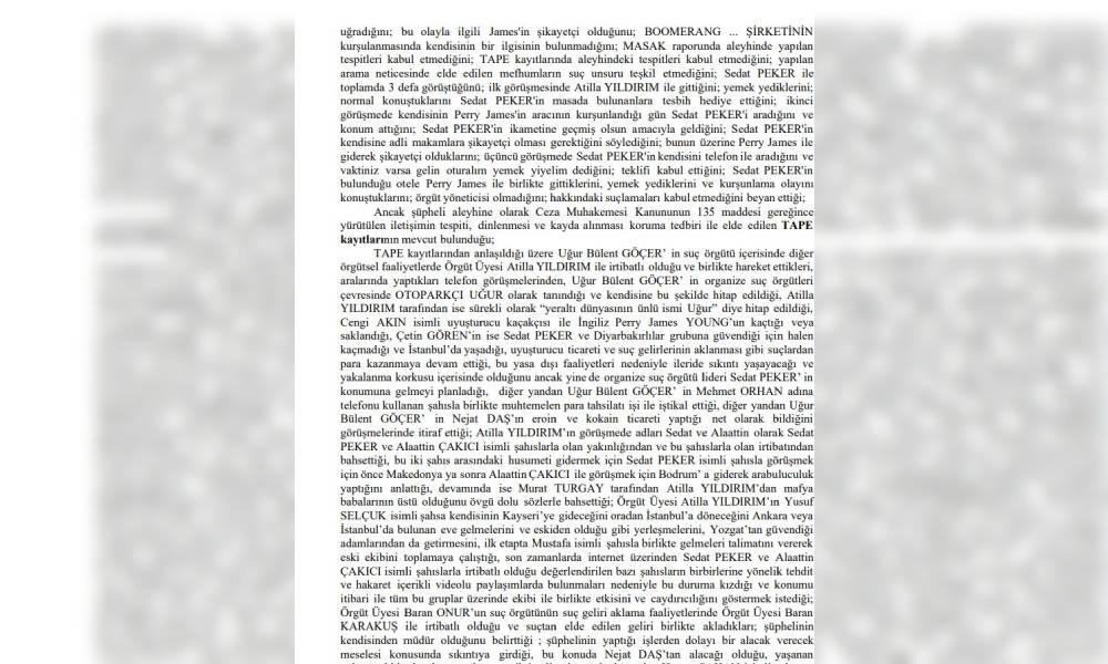 TAPE kayıtlarından anlaşıldığı üzere Uğur Bülent Göçer’ in suç örgütü içerisinde diğer örgütsel faaliyetlerde şüpheli ile irtibatlı olduğu ve birlikte hareket ettikleri, aralarında yaptıkları telefon görüşmelerinden, Uğur Bülent Göçer’ in organize suç örgütleri çevresinde Otoparkçı Uğur olarak tanındığı ve kendisine bu şekilde hitap edildiği, şüpheli tarafından ise sürekli olarak "yeraltı dünyasının ünlü ismi Uğur” diye hitap edildiği, Cengi Akın isimli uyuşturucu kaçakçısı ile İngiliz Perry James Young'un kaçtığı veya saklandığı; Çetin Gören'in ise Sedat Peker ve Diyarbakırlılar grubuna güvendiği için halen kaçmadığı ve İstanbul’da yaşadığı; uyuşturucu ticareti ve suç gelirlerinin aklanması gibi suçlardan para kazanmaya devam ettiği, bu yasa dışı faaliyetleri nedeniyle ileride sıkıntı yaşayacağı ve yakalanma korkusu içerisinde olduğunu ancak yine de organize suç örgütü lideri Sedat Peker'in konumuna gelmeyi planladığı; Türkiye hapishanelerinin ortamının Hollanda hapishanelerine benzemediği; Çetin Gören yakalandığı an tutuklu olduğu cezaevindeki irtibatlı oldukları şahıslara haber vererek kendisini cezalandırabileceklerini konuştukları; Çetin Gören’in güvendiği Diyarbakırlılar grubunun içerisinde Silvanlı Mehmet olarak tanınan Mehmet Salih Tulpar'da bulunduğu, diğer yandan Uğur Bülent Göçer'in Mehmet Orhan adına telefonu kullanan şahısla birlikte para tahsilatı işi ile iştikal ettiği; diğer yandan Uğur Bülent Göçer'in Nejat Daş’ın eroin ve kokain ticareti yaptığı net olarak bildiğini görüşmelerinde ifade ettiği; şüphelinin Sedat ve Alaattin olarak Sedat Peker ve Alaattin Çakıçı isimli şahıslarla olan yakınlığından ve bu şahıslarla olan irtibatından bahsettiği; bu iki şahıs arasındaki husumeti gidermek için Sedat Peker isimli şahısla görüşmek için önce Makedonya ya sonra Alaattin Çakıcı ile görüşmek için Bodrum’ a giderek arabuluculuk yaptığını anlattığı, devamında ise Murat Turgay tarafından şüpheliden mafya babalarının üstü olduğunu övgü dolu sözlerle bahsettiği; şüphelinin, Yusuf Selçuk isimli şahsa kendisinin Kayseri’ye gideceğini oradan İstanbul’a döneceğini Ankara veya İstanbul’da bulunan eve gelmelerini ve eskiden olduğu gibi yerleşmelerini, Yozgat’tan güvendiği adamlarından da getirmesini, ilk etapta Mustafa isimli şahısla birlikte gelmeleri talimatını vererek eski ekibini toplamaya çalıştığı; son zamanlarda internet üzerinden Sedat Peker ve Alaattin Çakıcı isimli şahıslarla irtibatlı olduğu değerlendirilen bazı şahısların birbirlerine yönelik tehdit ve hakaret içerikli videolu paylaşımlarda bulunmaları nedeniyle bu duruma kızdığı ve konumu itibari ile tüm bu gruplar üzerinde ekibi ile birlikte etkisini ve caydırıcılığını göstermek istediğine ilişkin görüşme içerikleri delillerinin elde edildiği yer aldı. Kolluk tarafından Uğur Bülent Göçer'in örgüt lideri Çetin Gören'i şüpheli aracılığıyla Sedat Peker ile bir araya getirerek tanıştırdığı, Çetin Gören'in Sedat Peker ile birlikte hareket ettiği izlenimi yaratarak diğer suç örgütleri karşısında güç gösterisi yapmak adına örgüt içerisinde böyle bir misyon üstlendiği; şüpheli Atilla Yıldırım'ın Ankara Cumhuriyet Başsavcılığının 2019/189754 sayılı soruşturma dosyasında şüpheli olarak değerlendirilen; Çetin Gören, Nejat Daş, Cemal Deniz Şahan, Uğur Bülent Göçer, Perry James Young isimli şüphelilerle ilişki ve irtibatının olduğu, suç gelirlerinin aklanması sırasında örgüt içi yaşanan çatışma ve olumsuzluklarda arabuluculuk görevini üstlenerek taraflar arasında bir hakem görevi gördüğü; şüphelinin Çetin Gören, Nejat Daş, Perry James Young, Cemal Deniz ŞAHAN isimli şahıslarla birlikte 01.12.2018 günü Gaziantep iline gittiği ve aynı gün dönüş yaptığı; 01/12/2018 tarihinde Gaziantep ilinde yapılan toplantıyı organize ettiği hususlarının tespit edildiği şüphelinin hakkındaki suçlama ile uyumlu olacak şekilde açık kaynak araştırma raporunda da gösterildiği şekilde fotoğrafların bulunduğu; Yapılan arama neticesinde 9x19 mm. çap ve tipinde fişek istimal eden ABD yapısı Ruger marka P85 model yarı otomatik tabanca ve bir adet şarjör ile 9x19 mm çap ve tipinde on dört adet fişeğin ele geçirildiği; 13/07/2020 tarihli uzmanlık raporuna göre arama neticesinde elde edilen materyallerin 6136 sayılı kanun kapsamında kaldıklarının bilimsel olarak mütalaa edildiği; 6136 sayılı kanuna muhalefet suçu bakımından soruşturma dosyasından tefrik kararı verildiği ve bu suç bakımından yürütülen soruşturma dosyasının Seri Muhakeme Bürosuna gönderildiği; Kolluk tespitleri, TAPE kayıtları, açık kaynak araştırma raporu, uzmanlık raporu ve tüm dosya kapsamındaki diğer deliller birlikte değerlendirildiğinde şüphelinin - süreklilik, çeşitlilik ve yoğunluk içeren eylemlerle silahlı suç örgütü faaliyetlerine üye olarak katılmak suretiyle üzerine atılı silahlı suç örgütüne üye olmak suçunu işlediği anlaşılmıştır"