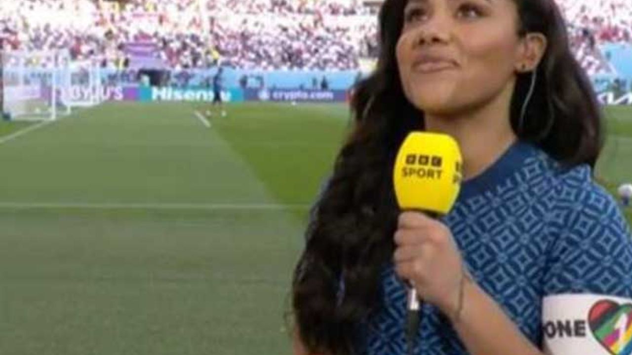 İngiltere Kadın Milli Futbol Takımı'nın eski savunmacısı Alex Scott, BBC için İngiltere-İran maçı öncesi yaptığı yayında OneLove pazubandını taktı.