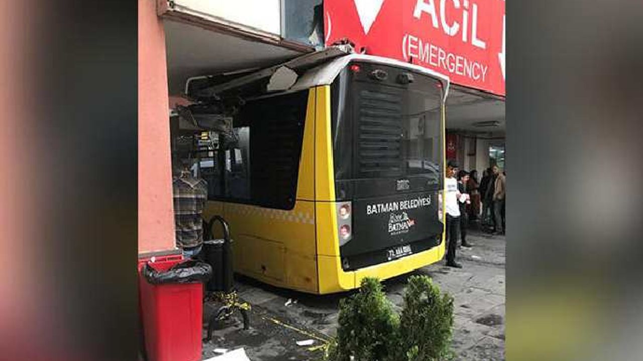 Batman’da, rahatsızlanan yolcunun hastaneye götürüldüğü belediye otobüsü, acil servisin tavanına sıkıştı.