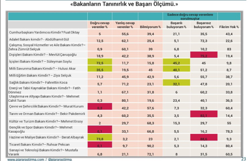 Piar’ın araştırmasına göre, katılımcıların yüzde 88,6’sının başarısız bulduğu Berat Albayrak’ı, yüzde 82,1 ile Tarım ve Orman Bakanı Bekir Pakdemirli, yüzde 75,2 oranıyla Dışişleri Bakanı Mevlüt Çavuşoğlu izledi. Pakdemirli’nin Tarım ve Orman Bakanı olduğunu bilenlerin oranı yüzde 4,3 olurken, en az tanınan bakanlar sıralamasında ilk 3’te, yüzde 0,1 oranıyla Ticaret Bakanı Ruhsar Pekcan ile Gençlik ve Spor Bakanı Mehmet Kasapoğlu, yüzde 0,2 oranıyla da Çevre ve Şehircilik Bakanı Murat Kurum oldu. Ekonomi ve Suriyeliler en önemli sorunlar Piar Araştırma’nın Temmuz Ayı Gündem Araştırması’na katılanların büyük çoğunluğu Türkiye’nin en önemli probleminin ekonomi (%26,4) olduğunu düşünüyor. İkinci sırada %18 ile Suriyeliler, üçüncü sırada %15,6 işsizlik yer aldı.