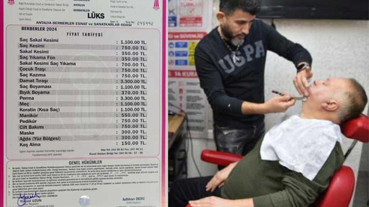 Antalya'da yeni yılda saç kesim fiyat fiyatlarında yüzde 80 artış yaşanırken yeni fiyat listesinde 1100 TL’lik ‘Lüks’ tarife dikkat çekti. Sosyal medyada tepki çeken tarifeye 'Tıraşın lüksü nasıl oluyor?', 'Altın makasla mı kesiyorlar' gibi yorumlar geldi.