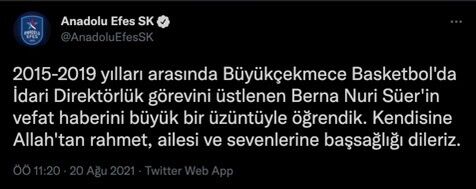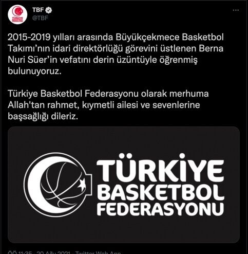 "2015-2019 yılları arasında Büyükçekmece Basketbol Takımı’nın idari direktörlüğü görevini üstlenen Berna Nuri Süer’in vefatını derin üzüntüyle öğrenmiş bulunuyoruz. Türkiye Basketbol Federasyonu olarak merhuma Allah'tan rahmet, kıymetli ailesi ve sevenlerine başsağlığı dileriz."