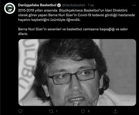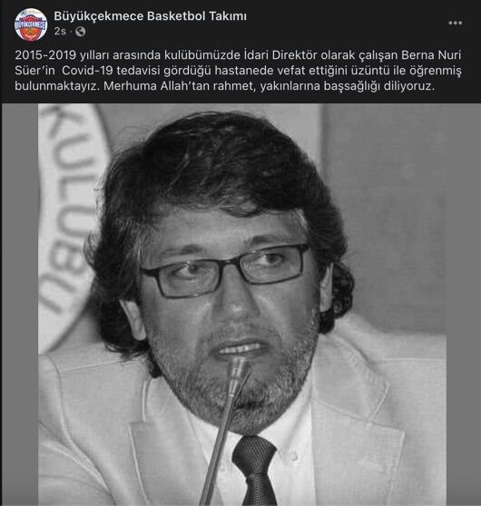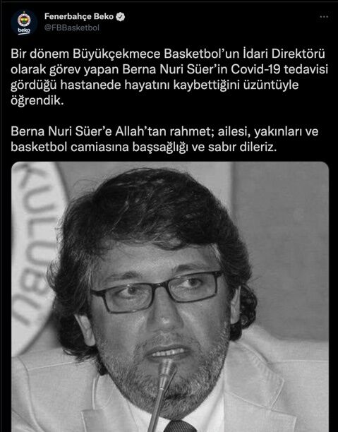 "Bir dönem Büyükçekmece Basketbol’un İdari Direktörü olarak görev yapan Berna Nuri Süer’in Covid-19 tedavisi gördüğü hastanede hayatını kaybettiğini üzüntüyle öğrendik. Berna Nuri Süer’e Allah’tan rahmet; ailesi, yakınları ve basketbol camiasına başsağlığı ve sabır dileriz."