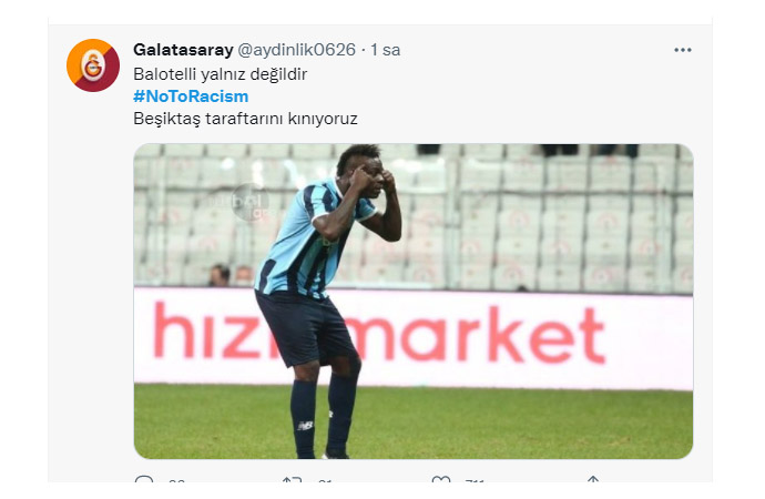 Beşiktaş taraftarı Mario Balotelli'nin sosyal medya hesabından 'maymun' muz' gibi ırkçılığı simgeleyen paylaşımlarda bulundu. Sosyal medya kullanıcıları Twitter üzerinden #NoToRacism etiketiyle Balotelli'ye destek mesajlarında bulundu.