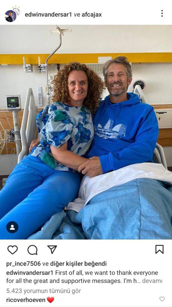 Eşiyle beraber hastane odasında çektirdikleri fotoğrafı Instagram hesabından paylaşan Van der Sar, "Öncelikle destek mesajı gönderen herkese teşekkür etmek istiyoruz. Hala hastanede olsam da yoğun bakım ünitesinden çıktığımı paylaşmaktan dolayı mutluyum. Gelecek hafta eve dönmeyi ve tedavimin sonraki aşamasına geçmeyi umuyorum" ifadelerini kullandı.