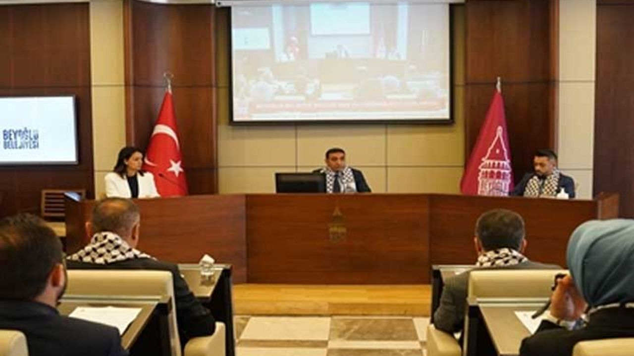 Beyoğlu Belediye Meclis üyelerinin Filistin'e destek için atkılarla katıldığı toplantıda Başkan İnan Güney, ''İsrail’in karşısında, mazlum Filistin halkının yanında durmak, her gün gözyaşı döken çocukların yanında durmak, onların sesini haykırmak insani, vicdani ve ahlaki bir görevdir diye düşünüyorum'' dedi.