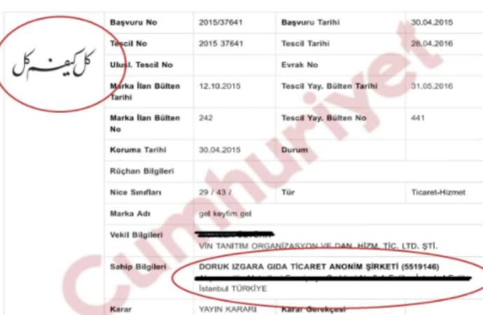 AKP'li Cumhurbaşkanı Recep Tayyip Erdoğan’ın oğlu Bilal Erdoğan’ın ortağı olduğu Doruk Izgara adlı şirketin “Gel Keyfim Gel” ismini Osmanlıca yazım şekli ile tescil ettirdiği iddia edildi.