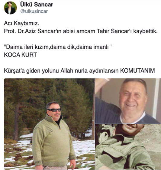 Vefat haberini Aziz Sancar’ın kızı Ülkü Sancar, sosyal medya hesabından duyurdu. Ülkü Sancar, şu ifadeleri kullandı: “Acı Kaybımız. Prof. Dr. Aziz Sancar’ın abisi amcam Tahir Sancar’ı kaybettik. ‘Daima ileri kızım, daima dik, daima imanlı’KOCA KURT Kürşat’a giden yolunu Allah nurla aydınlansın KOMUTANIM”