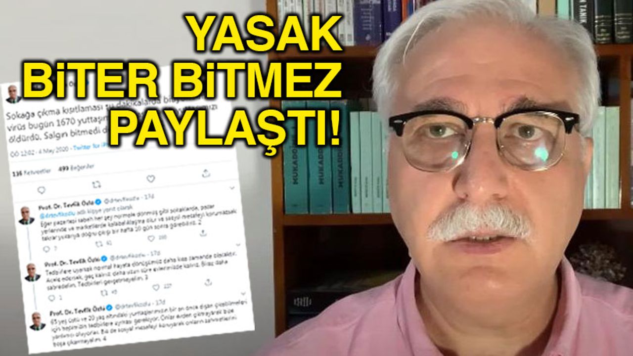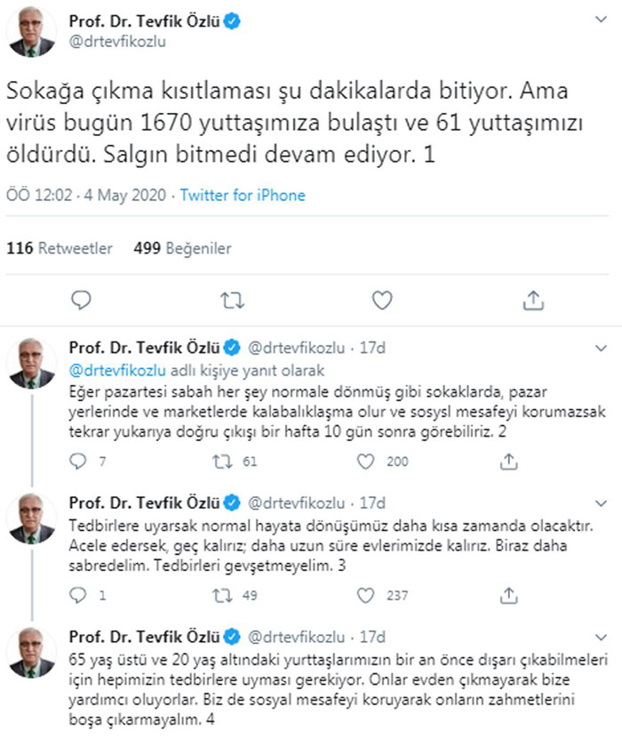Sağlık Bakanlığı Koronavirüs Bilim Kurulu Üyesi ve Göğüs Hastalıkları Uzmanı Prof. Dr. Tevfik Özlü, virüs salgının bitmediğini ve devam ettiğini ifade etti. Özlü, "Eğer pazartesi sabah her şey normale dönmüş gibi sokaklarda, pazar yerlerinde ve marketlerde kalabalıklaşma olur ve sosyal mesafeyi korumazsak tekrar yukarıya doğru çıkışı bir hafta 10 gün sonra görebiliriz" dedi.