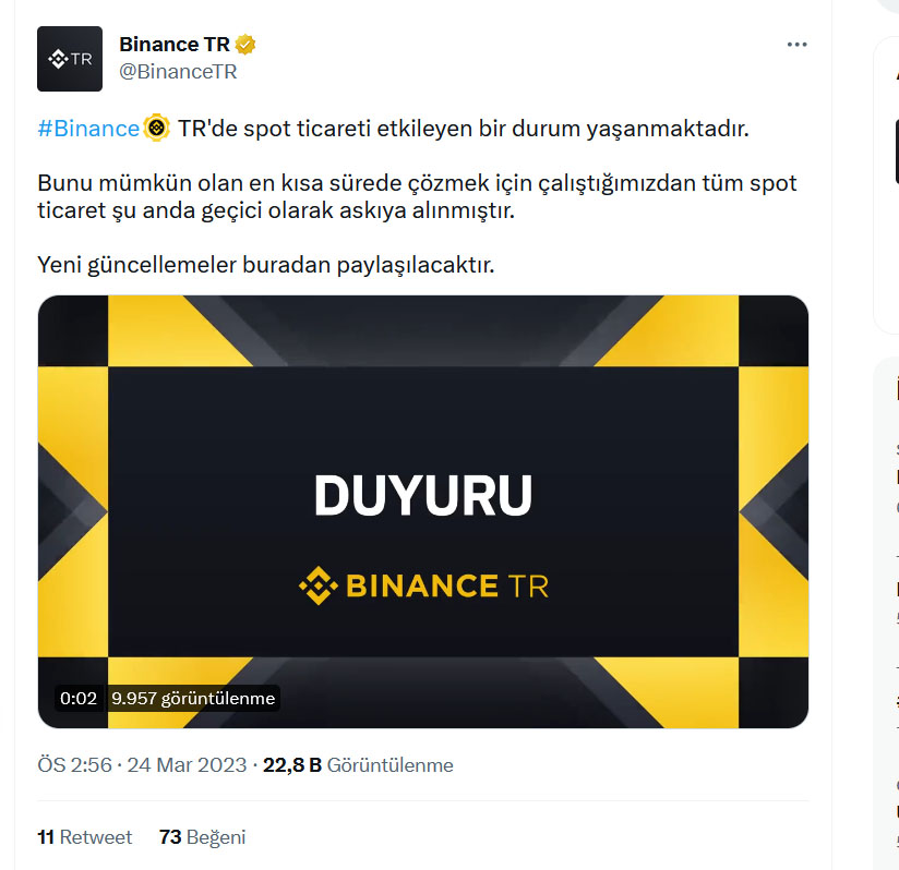 Binance'ın Twitter hesabından yapılan açıklamada, şu ifadelere yer verildi: "Binance TR'de spot ticareti etkileyen bir durum yaşanmaktadır. Bunu mümkün olan en kısa sürede çözmek için çalıştığımızdan tüm spot ticaret şu anda geçici olarak askıya alınmıştır. Yeni güncellemeler buradan paylaşılacaktır."