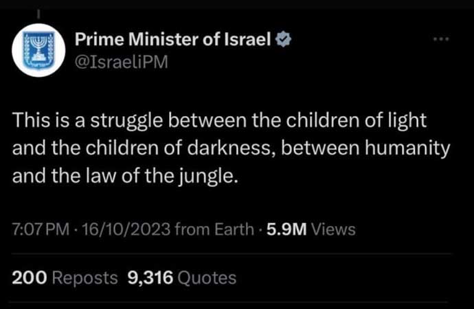 Binyamin Netanyahu’nun ofisinin sosyal medya hesabından iki gün önce İsrail parlamentosunda yaptığı konuşmada sarf ettiği “Bu mücadele ışığın çocukları ile karanlığın çocukları, insanlık ile orman kanunları arasındadır” ifadelerinin yer aldığı sözlerinin yer aldığı bir paylaşım yapılmıştı.