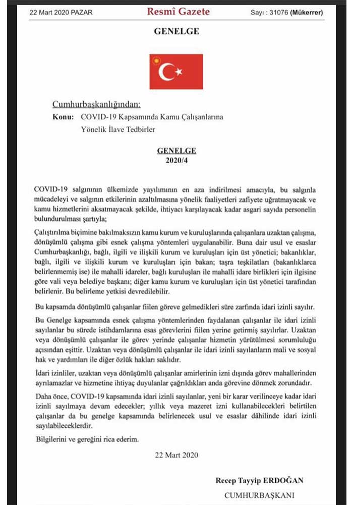 Kamu kurum ve kuruluşlarında çalışanlara, uzaktan çalışma, dönüşümlü çalışma gibi esnek çalışma yöntemi uygulanabilmesine ve idari izin verilmesine ilişkin Cumhurbaşkanlığı Genelgesi yayınlandı.