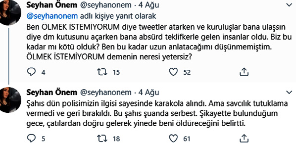 Uzaklaştırma olmasına rağmen apartmanın önünde bekledi. Telefonda sosyal medyada kendisiyle arkadaş olmamı, neler paylaştığımı görmek istediğini söyledi. Kabul etmeyince hakaret ve tehditte bulundu. Telefonda kendisini engelleyince de ablama silah fotoğrafı gönderip tehdit mesajları attı. Ablam da ben de şikâyetçi olduk. Yaşadıklarımı da Twitter’da paylaşınca hızla yayıldı ve bunun üzerine ifadeye çağrıldı. Ancak ifadesi alındıktan sonra serbest bırakıldı. Karakolda kadın polisler çok duyarlı ama savcılık serbest bırakıyor. Ben ve ailem hayatımızdan endişe ediyoruz. Korkudan evde hapis hayatı yaşıyorum. Yetkililere sesleniyorum, bizi koruyun.”