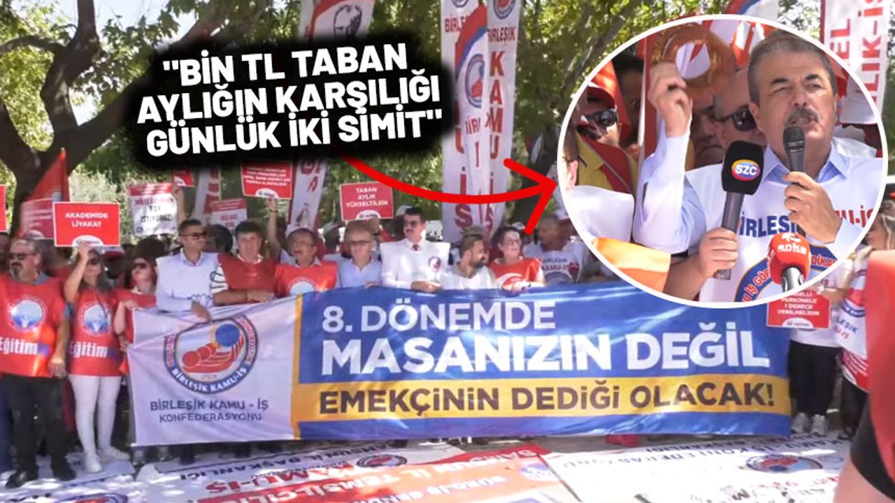 -İkinci gün ikinci toplantıda sendika başkanlarıyla Çalışma Bakanı karşımıza oturdu. Revize ettiğiniz rakamlar nedir dedik? Dedi ki bin TL aylık. Bin TL taban aylığın karşılığı günlük iki simit. Bize önerdikleri rakam bu. Emekçilere diyor ki, 'İki simit size yeter. Yanına çayı da kendi cebinizden için' Bizi iki simide eş değer görenleri asla affetmeyeceğiz. O masa o iki simidi de hiçbir konfederasyon bizim bulunduğumuz yerde kabul edemez. Simit adına bizimle maaş hesabı kimseye yaptırmayacağız."