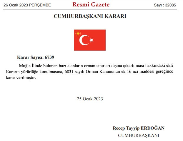 AKP'li Cumhurbaşkanı Recep Tayip Erdoğan'ın imzasıyla Resmi Gazete'de yayımlanan kararla Muğla'nın Bodrum ilçesindeki bazı alanlar orman sınırları dışına çıkartıldı.