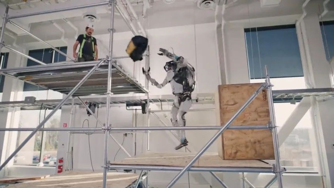 Bu sefer, insansı makine, yalnızca roboparkour güçlerini kullanarak bir alet çantasını bir iskelenin tepesine teslim etti. Videoda Atlas, alet çantasını almaya gitmeden önce şaşırtıcı miktarda bir performans sergiliyor.