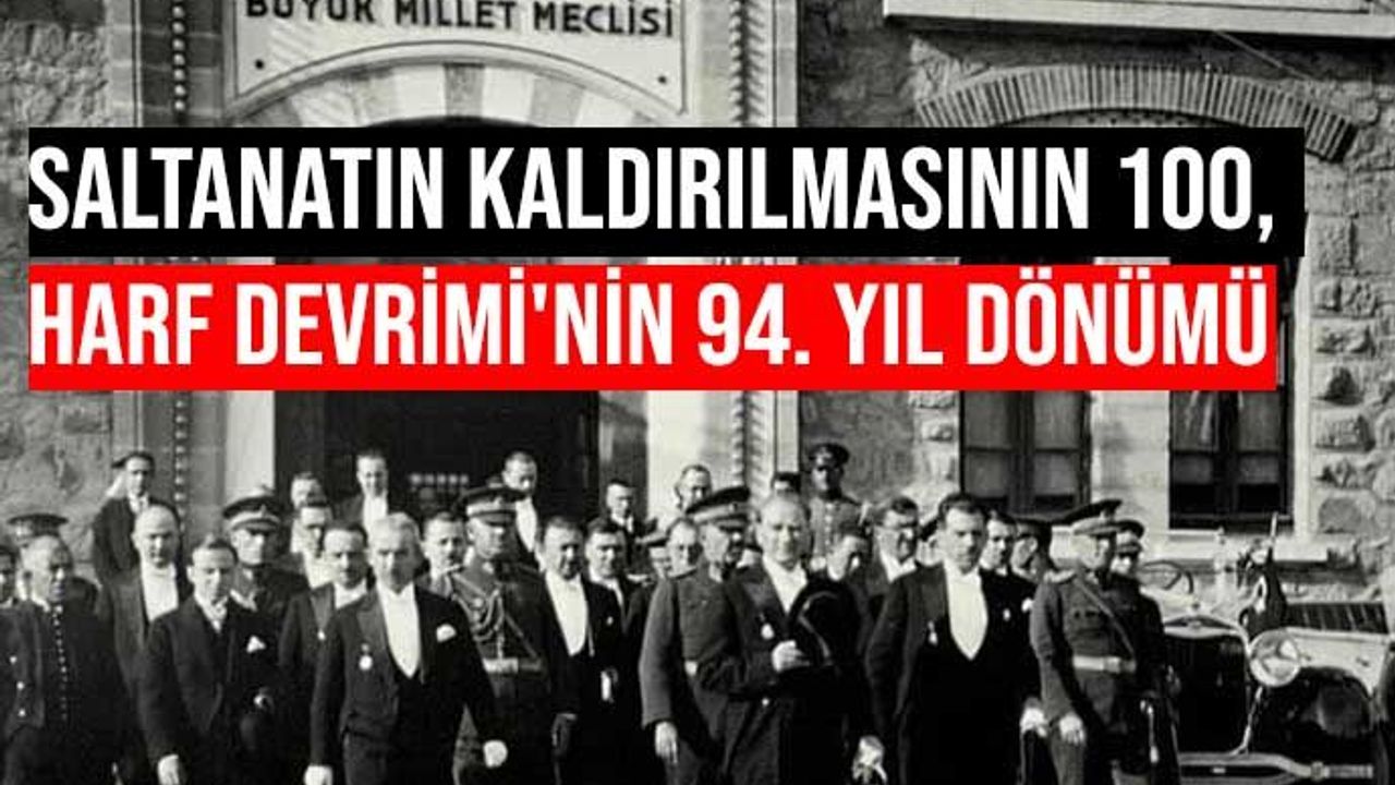 Bugün, 23 Nisan 1920'de kurulan Türkiye Büyük Millet Meclisi (TBMM) kabulüyle 1 Kasım 1922'de saltanat kaldırılmasının 100., 1 Kasım 1928 tarihinde ise gerçekleşen 'Harf Devrimi'nin ise 94. yıl dönümü.