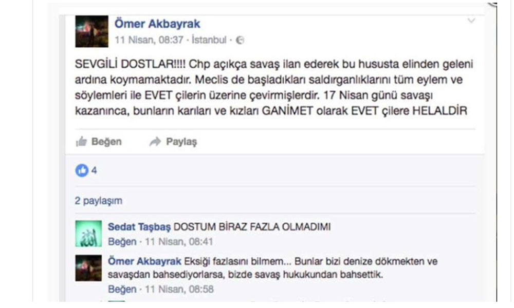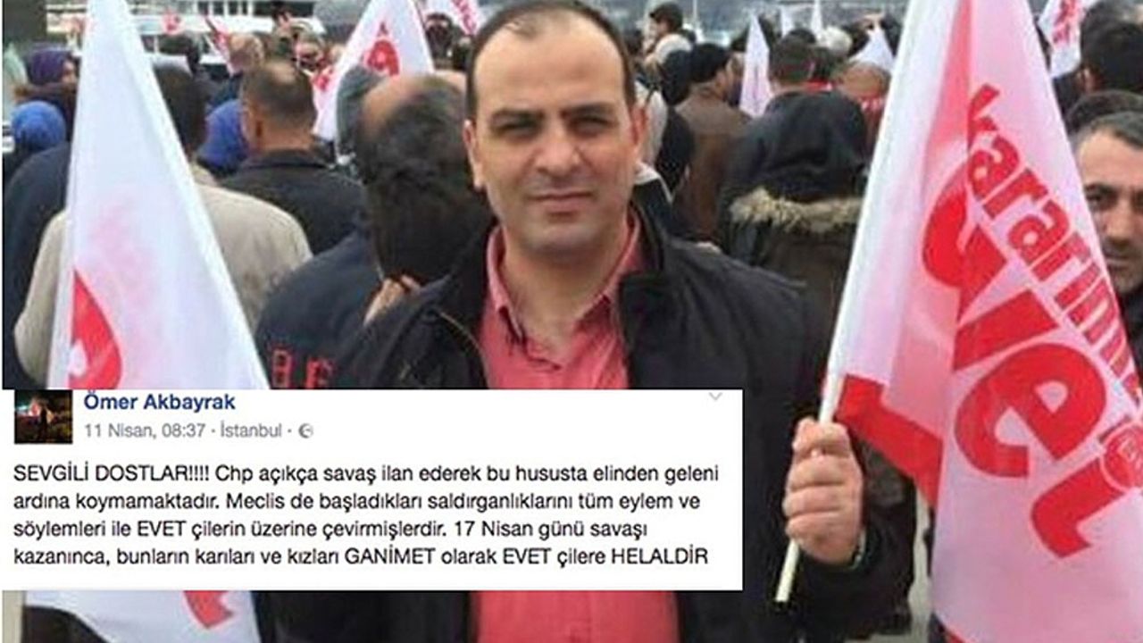 Referandumdan önce Akbayrak, sosyal medya hesabından “17 Nisan günü savaşı kazanınca, bunların karıları ve kızları GANİMET olarak EVET’çilere HELALDİR” paylaşımında bulundu.Yurt Gazetesi’nde yer alan habere göre; Ömer Akbayrak adlı İBB çalışanının 16 Nisan 2017’deki Anayasa Değişikliği Referandumuna ilişkin skandal paylaşımı ortaya çıktı.