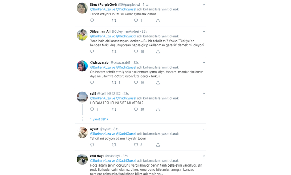 Burhan Kuzu'nun tehdidine sosyal medya kullanıcıları tarafından tepki yağdı: "Tehdit ediyorsunuz! Bu kadar aymazlik olmaz" "Ama hala akillanmamışsın' derken... Bu bir tehdit mi? Yoksa 'Türkiye'de benden farklı düşünüyorsan hapse girip akıllanman gerekir' demek mi oluyor?" "Oo hocam tehdit etmiş hala akıllanmamışsınız diye. Hocam insanlar akıllansın diye mi Silivri’ye götürülüyor? İşte gerçek hukuk"Kadri Bey bunca badire atlattın ama hâlâ akıllanmamışınız.Lozan ile ilgili bu tür farklı tespitleri hiç mi duymadınız?Hani siz içeride farklı görüşünüzden dolayı hapis yatmıştınız?Hani siz düşünce özgürlüğünden yanaydınız?Yazıklar olsun size ve sizin gibi bağnsz solculara.