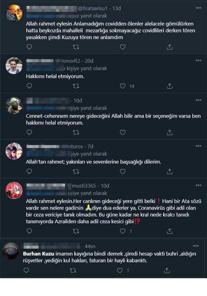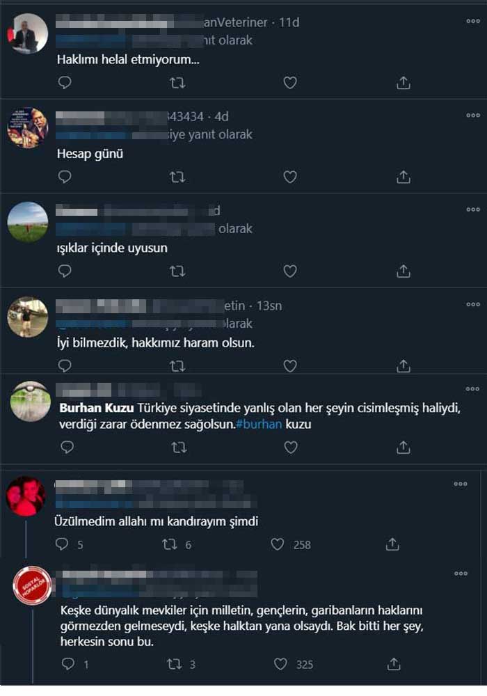 Twitter'da gördüğüm çoğu twitinde kizsamda bu sefer adını Twitter'da görünce gerçekten çok üzüldüm. Burhan Kuzu mekânın cennet olsun, Allah ailene sabırlar versin. Farklı görüşlere sahip olmak insanlığımızı kaybettirmesin ne olursa olsun sağlıkta ve ölümde görüş ayrılıkları olmaz