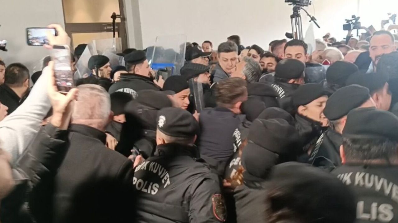 Bugün seçimin yapılacağı Büyükşehir Belediye binası önünde geniş güvenlik önlemi alındı. CHP’liler, saat 11.00'de yapılacağı açıklanan seçim için belediye binası önüne gelmeye başladı. Barikatları geçmeye çalışan partililer ile polis arasında tartışma çıktı. Kalabalık barikatı aşarken, CHP'li milletvekilleri ile ilçe belediye başkanları ve il örgütü üyeleri otoparktan binaya girmek istedi. Seçimin yapılacağı meclis salonuna sadece belediye meclis üyelerinin alınmasına izin verilirken, polis ile partililer arasında arbede çıktı. Binanın otopark kapısının camı kırıldı, Çevik Kuvvet polisleri kalabalığa biber gazıyla müdahale etti.