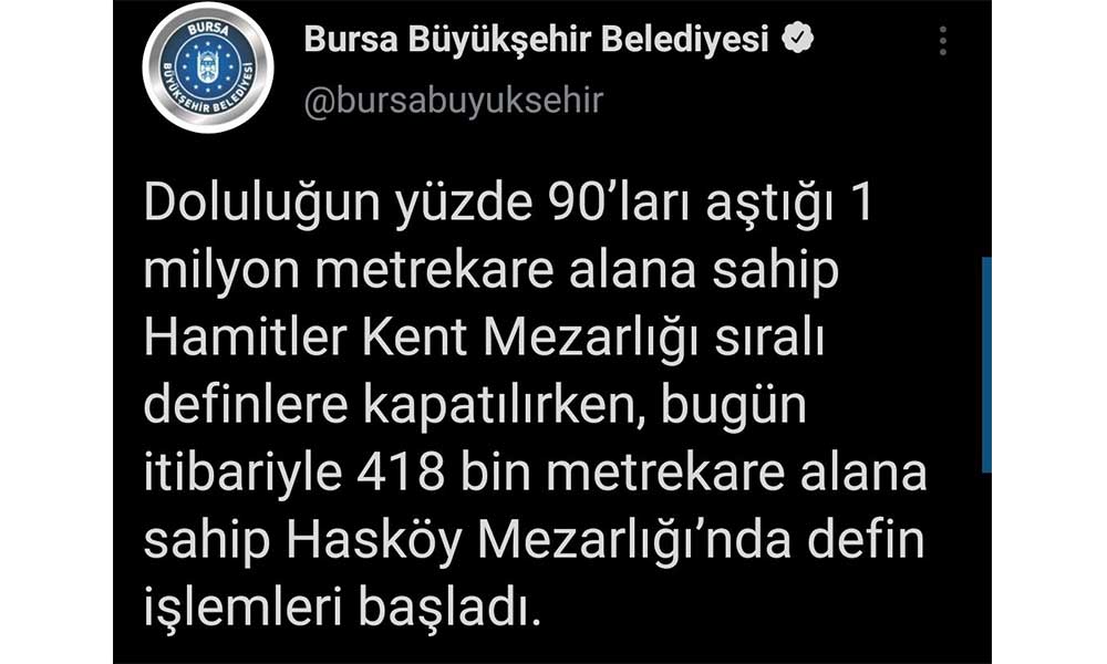 Bursa Büyükşehir Belediyesi, doluluğun yüzde 90'ları aştığı 1 milyon metrekare alana sahip Hamitler Kent Mezarlığı’nın sıralı definlere kapatıldığını duyurdu. Definlerin bugün itibarıyla 418 bin metrekare alana sahip Hasköy Mezarlığı'nda yapılacağı belirtildi. Hamitler’e geçen yıl 19 bin 870 defin işlemi yapıldığı öğrenildi.VAKA SAYISI İKİ KAT ARTTI
