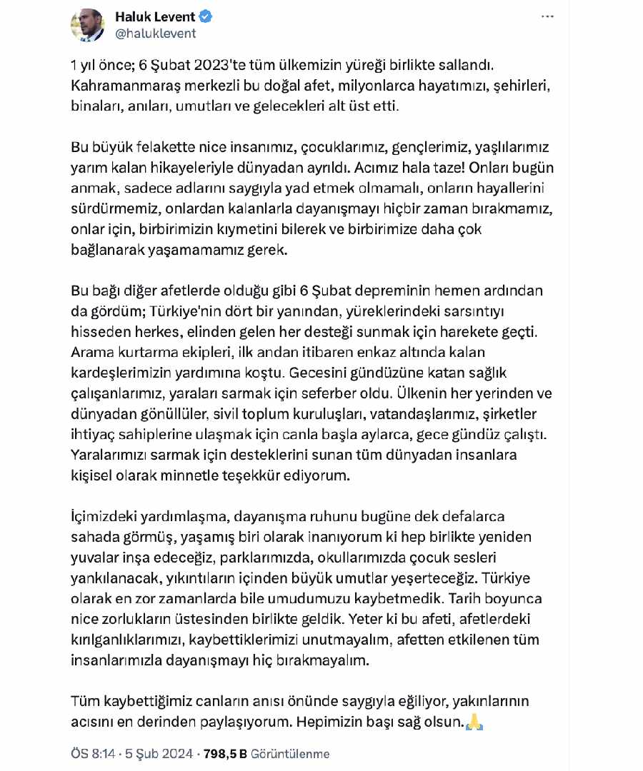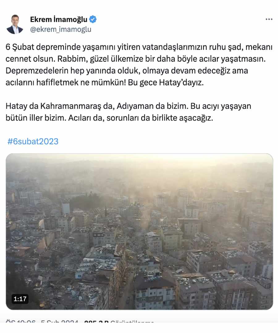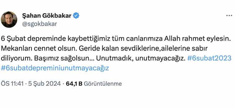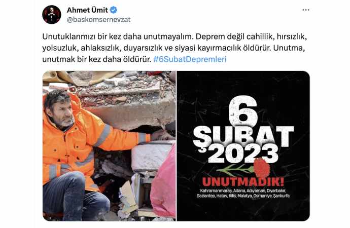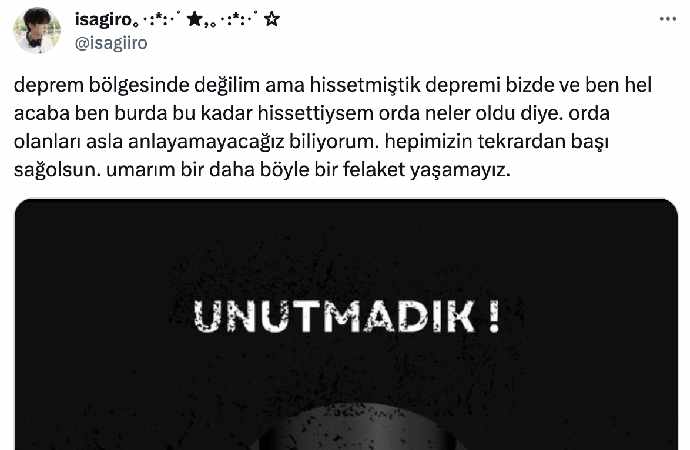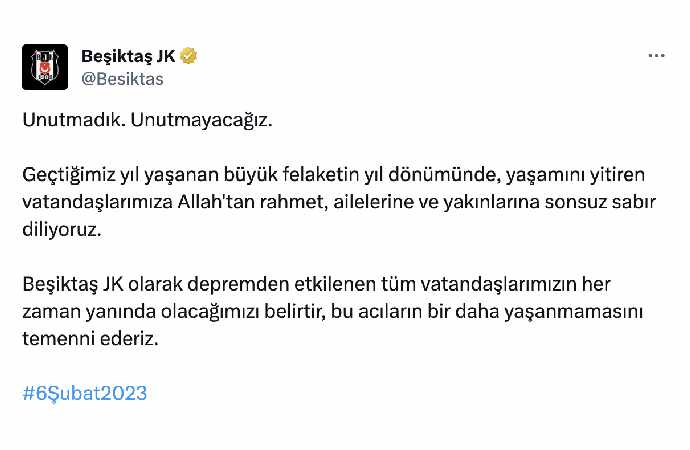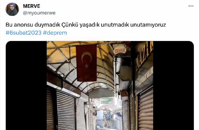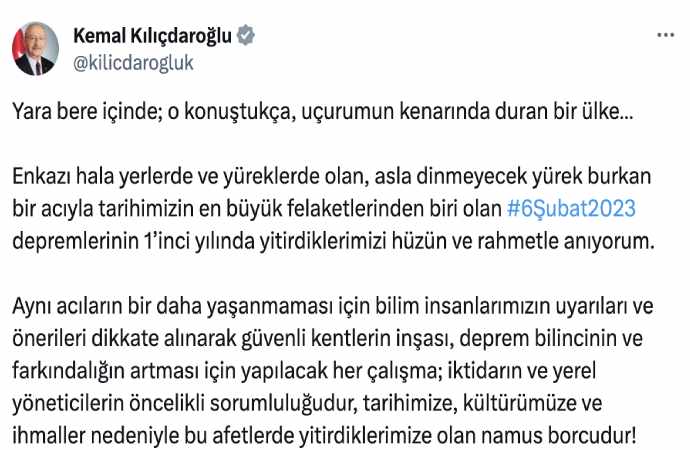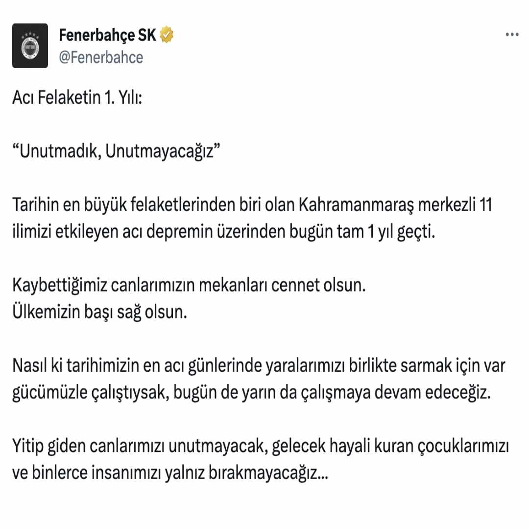 Tam 1 yıl önce bugün, 6 Şubat 2023... Hafızalarımıza unutulmayacak bir acıyla kazındı. Kahramanmaraş merkezli meydana gelen depremler 11 ilimizde yıkım oluşturdu. 57 bin 537 insanımız hayatını kaybetti. Türkiye acısını unutmadı. Depremin yıl dönümünde vatandaşlar sosyal medya hesaplarından hayatını kaybedenleri andı. Siyasilerden sanatçılara, futbol kulüplerinden sporculara birçok hesaptan paylaşım geldi. İşte o paylaşımlar: