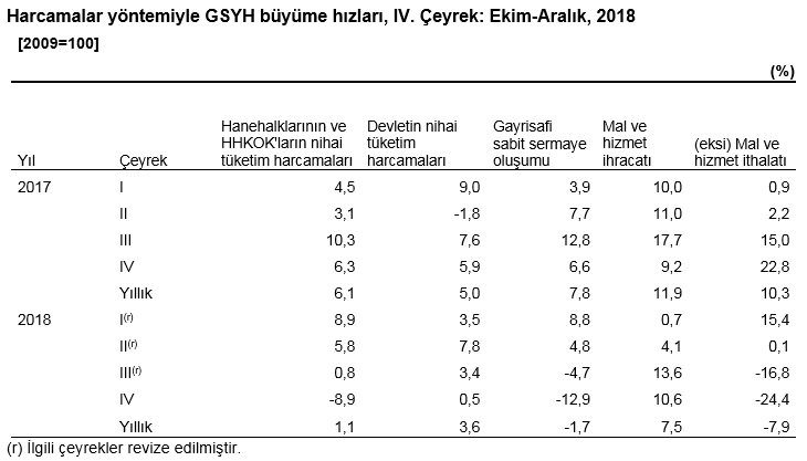 Gayrisafi Yurt İçi Hasıla dördüncü çeyrek ilk tahmini; zincirlenmiş hacim endeksi olarak (2009=100), 2018 yılının dördüncü çeyreğinde bir önceki yılın aynı çeyreğine göre %3 azaldı. Üretim yöntemiyle Gayrisafi Yurt İçi Hasıla tahmini, 2018 yılının dördüncü çeyreğinde cari fiyatlarla %13,4 artarak 1 trilyon 10 milyar 114 milyon TL oldu. Gayrisafi Yurt İçi Hasılayı oluşturan faaliyetler incelendiğinde; 2018 yılının dördüncü çeyreğinde bir önceki yılın aynı çeyreğine göre zincirlenmiş hacim endeksi olarak; tarım sektörü toplam katma değeri %0,5, sanayi sektörü %6,4 ve inşaat sektörü %8,7 azaldı. Ticaret, ulaştırma, konaklama ve yiyecek hizmeti faaliyetlerinin toplamından oluşan hizmetler sektörünün katma değeri %0,3 azaldı. Takvim etkisinden arındırılmış GSYH zincirlenmiş hacim endeksi, 2018 yılı dördüncü çeyreğinde bir önceki yılın aynı çeyreğine göre %3,2 azaldı. Mevsim ve takvim etkilerinden arındırılmış GSYH zincirlenmiş hacim endeksi, bir önceki çeyreğe göre %2,4 azaldı.Hanehalkı nihai tüketim harcamaları 2018 yılında %1,1 arttı