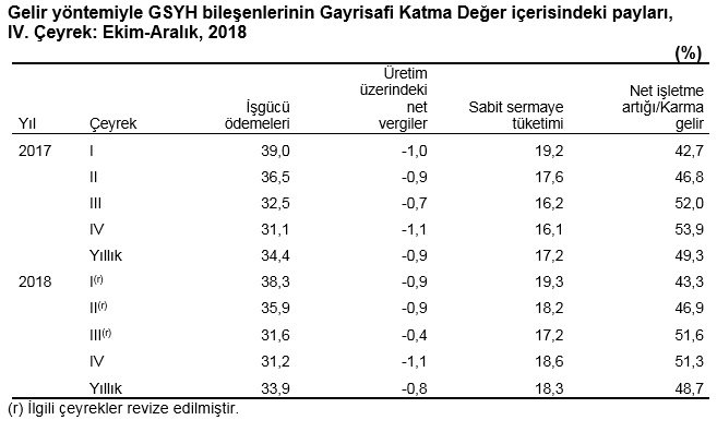 İşgücü ödemelerinin cari fiyatlarla Gayrisafi Katma Değer içerisindeki payı geçen yılın aynı çeyreğinde %31,1 iken bu oran 2018 yılının dördüncü çeyreğinde %31,2 oldu. Net işletme artığı/karma gelirin payı ise %53,9’dan %51,3’e düştü.