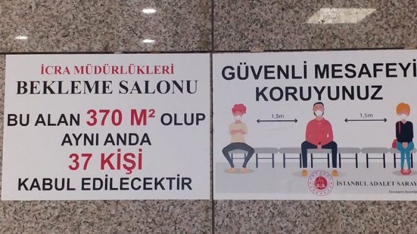 Çağlayan Adliyesi'ne sosyal mesafenin korunması için asılan afişler sosyal medyada tepki çekti.