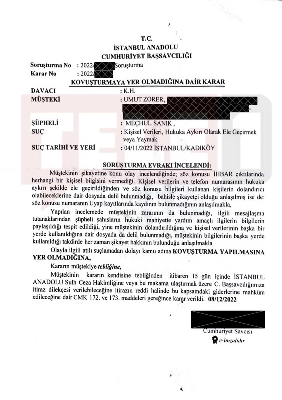 “Müştekinin şikayetine konu olay incelendiğinde; söz konusu İHBAR çıktılarında herhangi bir kişisel bilgisini vermediği. Kişisel verilerin ve telefon numarasının hukuka aykırı şekilde ele geçirildiğinden ve söz konusu bilgileri kullanan kişilerin dolandırıcı olabileceklerine dair dosyada delil bulunmadığı, bahisle şikayetçi olduğu anlaşılmış ise de: söz konusu numaranın Uyap kayıtlarında kaydının bulunmadığının anlaşılmakla,
