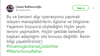 Canan Kaftancıoğlu paylaşımında, 'Bu ve benzeri algı operasyonu yapmak isteyen manüplatörlerin ilgisine ve bilgisine: Yaşamım boyunca söylediğim hiçbir şeyin tersini yapmadım. Hiçbir şekilde belediye başkan adaylığım söz konusu değildir. Kesin bilgi yayabilirsiniz:)' ifadelerini kullandı.