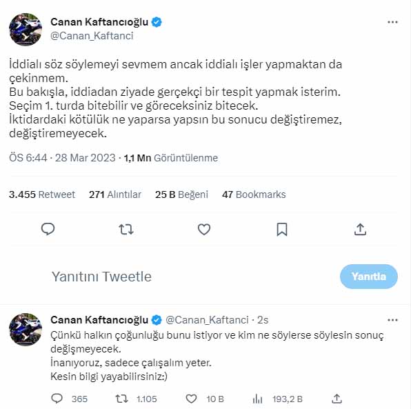 Türkiye'de yurttaşlar 14 Mayıs günü yapılacak olan Cumhurbaşkanlığı seçimine kilitledi. Partiler ve Cumhurbaşkanı adayları seçim çalışmalarına hız kesmeden devam ederken CHP İstanbul İl Başkanı Canan Kaftancıoğlu sosyal medya hesabından "Kesin bilgi yayalım" diyerek, "Seçim 1. turda bitebilir ve göreceksiniz bitecek" paylaşımını yaptı. https://tele1.com.tr/canan-kaftancioglu-uyardi-bilmedigimizi-zannetmeyin-fatura-size-cikar-800966/ Kaftancıoğlu'nun paylaşımı şöyle: "İddialı söz söylemeyi sevmem ancak iddialı işler yapmaktan da çekinmem. Bu bakışla, iddiadan ziyade gerçekçi bir tespit yapmak isterim. Seçim 1. turda bitebilir ve göreceksiniz bitecek. İktidardaki kötülük ne yaparsa yapsın bu sonucu değiştiremez, değiştiremeyecek. Çünkü halkın çoğunluğu bunu istiyor ve kim ne söylerse söylesin sonuç değişmeyecek. İnanıyoruz, sadece çalışalım yeter. Kesin bilgi yayabilirsiniz:)"