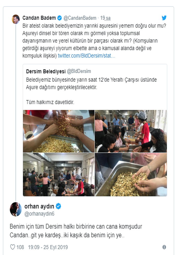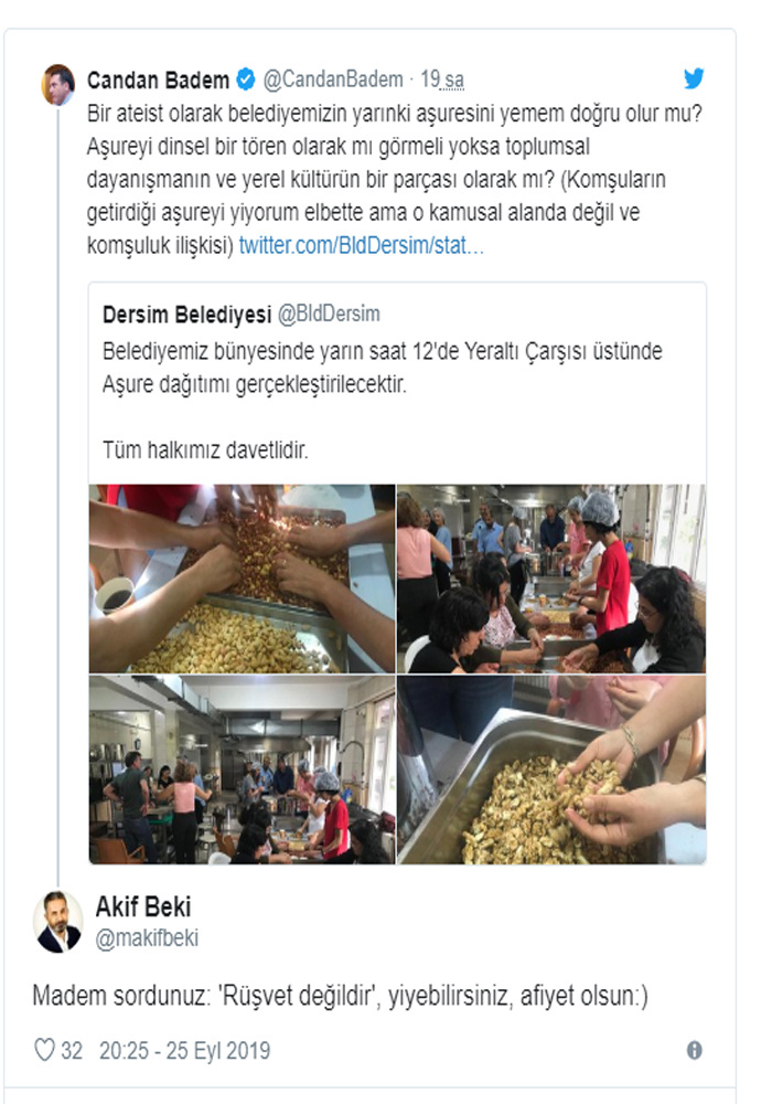 Akademisyen Candan Badem Tunceli Belediyesinin aşure etkinliğine ilişkin ilginç bir soru ortaya attı. Yanıt Akif Beki’den geldi.
