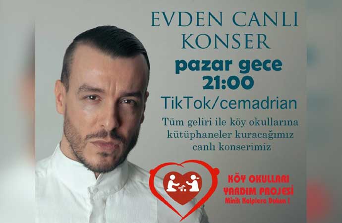 Eşsiz sesiyle tanınan başarılı sanatçı Cem Adrian, bu kez Köy Okulları Yardım Projesi Derneği’nin kütüphane açma projesi için söyleyecek. Adrian, video paylaşma platformu TikTok üzerinden konser vererek bağış toplayacak.