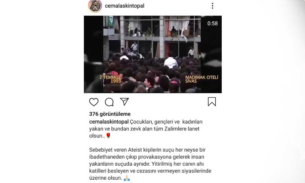 Onursal Başkanı İzzettin Doğan olan Cem Vakfı’nın Gençlik Kolu Başkanı Cemal Aşkın Topal Sivas Katliamı’na ilişkin sosyal medya hesabından bir açıklama yayınladı. Açıklamada, "Sebebiyet veren Ateist kişilerin suçu her neyse bir ibadethaneden çıkıp provakasyona gelerek insan yakanların suçu da aynıdır. Yitirilmiş her canın ahı katilleri besleyen ve cezasını vermeyen siyasilerinde üzerine olsun" ifadeleri büyük tepki çekti.