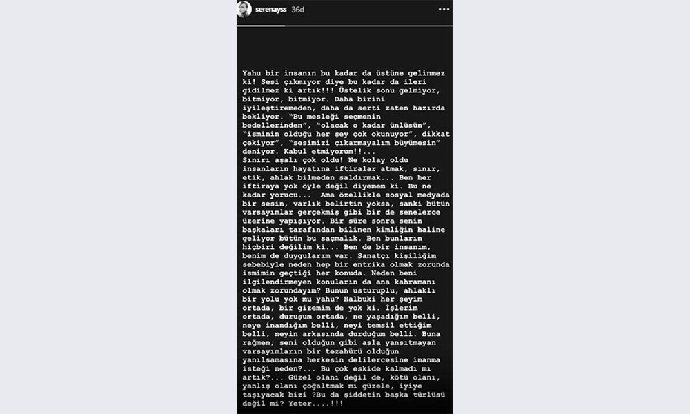 Özel hayatıyla ilgili konularda hep sessiz kalan Sarıkaya, "Her şeyim ortada , bir gizemim yok, duruşum ortada, ne yaşadığım belli. Güzel olanı değil de kötü olanı, yanlış olanı çoğaltmak mı güzele, iyiye taşıyacak bizi? Bu da şiddetin başka türlüsü değil mi? Yeter" dedi.
