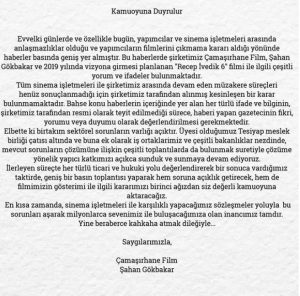 Gökbakar sözlerine şöyle devam etti "İlerleyen süreçte her türlü ticari ve hukuki yolu değerlendirerek bir sonuca vardığımız takdirde geniş bir basın toplantısı yaparak hem soruna açıklık getirecek hem de filmimizin gösterimi ile ilgili kararımızı birinci ağızdan siz değerli kamuoyua aktaracağız"