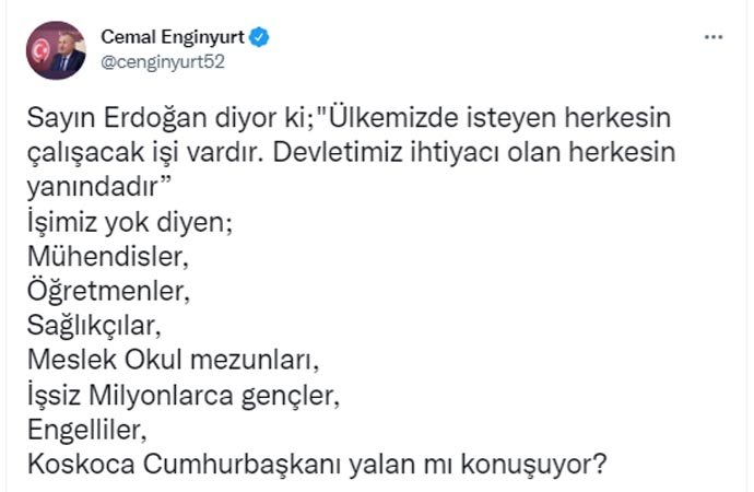 AKP grup toplantısında grup toplantısında "Ülkemizde isteyen herkesin çalışacak işi vardır. Devletimiz ihtiyacı olan herkesin yanındadır. Ülkemizde isteyen herkesin çalışacak işi vardır” ifadelerini eleştiren Enginyurt, yaptığı paylaşımda şu ifadelere yer verdi: Sayın Erdoğan diyor ki; "Ülkemizde isteyen herkesin çalışacak işi vardır. Devletimiz ihtiyacı olan herkesin yanındadır” İşimiz yok diyen; Mühendisler, Öğretmenler, Sağlıkçılar, Meslek Okul mezunları, İşsiz Milyonlarca gençler, Engelliler, Koskoca Cumhurbaşkanı yalan mı konuşuyor?