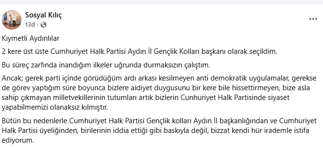 CHP Aydın İl Gençlik Kolları Başkanı Sosyal Kılıç da sosyal medya hesabından yaptığı paylaşımla istifa ettiğini duyurmuş, şunları söylemişti: