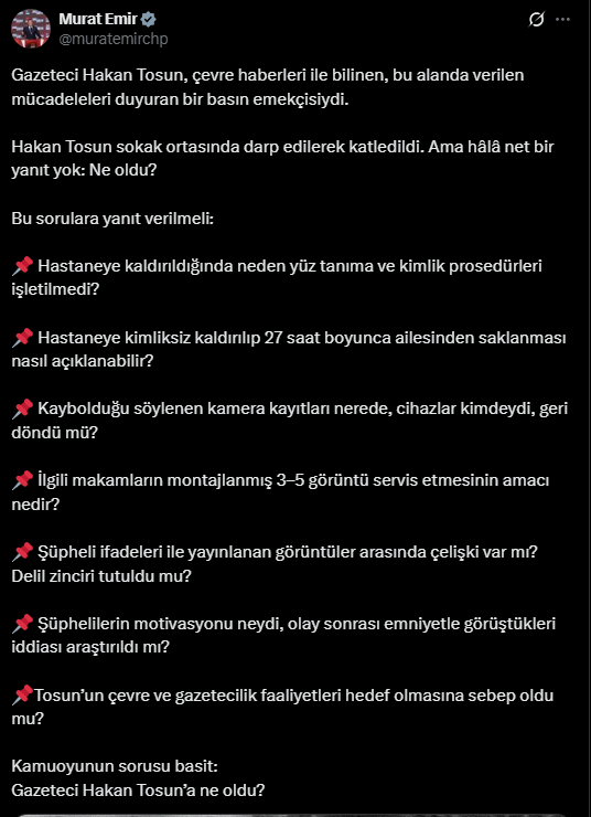 CHP, Grup Başkanvekili Murat Emir sosyal medya hesabından yaptığı paylaşımda "Hastaneye kimliksiz kaldırılıp 27 saat boyunca ailesinden saklanması nasıl açıklanabilir?" diye sordu.