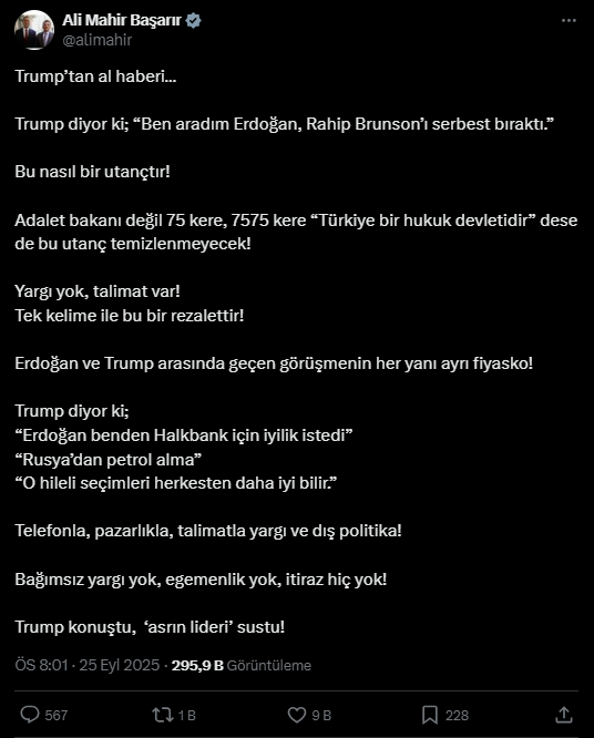 "Trump’tan al haberi… Trump diyor ki; ‘Ben aradım Erdoğan, Rahip Brunson’ı serbest bıraktı.’ Bu nasıl bir utançtır! Adalet bakanı değil 75 kere, 7575 kere ‘Türkiye bir hukuk devletidir’ dese de bu utanç temizlenmeyecek! Yargı yok, talimat var! Tek kelime ile bu bir rezalettir! Erdoğan ve Trump arasında geçen görüşmenin her yanı ayrı fiyasko! Trump diyor ki; ‘Erdoğan benden Halkbank için iyilik istedi’ ‘Rusya’dan petrol alma’ ‘O hileli seçimleri herkesten daha iyi bilir.’ Telefonla, pazarlıkla, talimatla yargı ve dış politika! Bağımsız yargı yok, egemenlik yok, itiraz hiç yok! Trump konuştu, ‘asrın lideri’ sustu!"