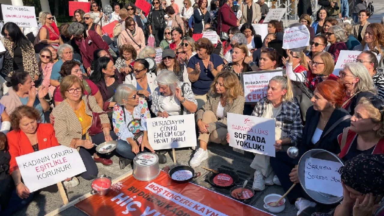“Bu tencere boş çünkü sarayın sofraları taşıyor”, “Buradayım çünkü kaynamayan tencerede AKP’nin tuzu var” ve “Aile yılı müjdesi boş tencere” yazılı pankartlar taşıyan kadınlar, boş tencerelere vurarak düdük çaldı.