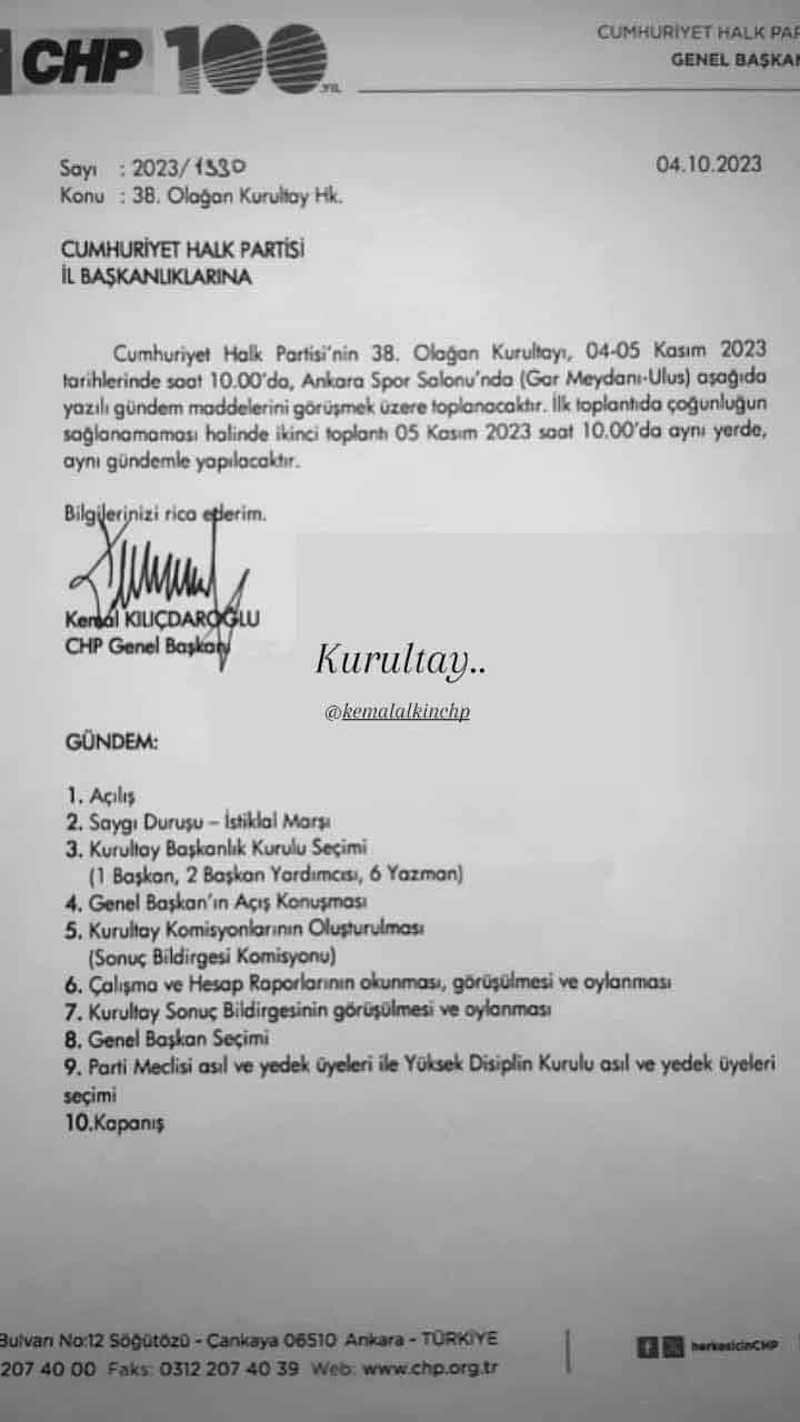 Cumhuriyet Halk Partisi'nin 38. Olağan Kurultayı, 04-05 Kasım 2023 tarihlerinde saat 10.00'da, Ankara Spor Salonu'nda (Gar Meydanı-Ulus) aşağıda yazılı gündem maddelerini görüşmek üzere toplanacaktır. İlk toplantıda çoğunluğun sağlanamaması halinde ikinci toplantı 05 Kasım 2023 saat 10.00'da aynı yerde, aynı gündemle yapılacaktır.