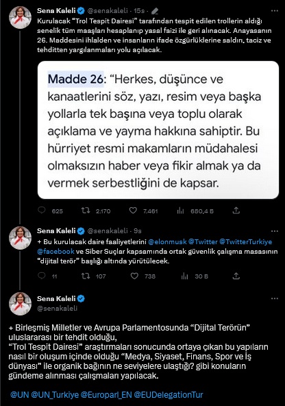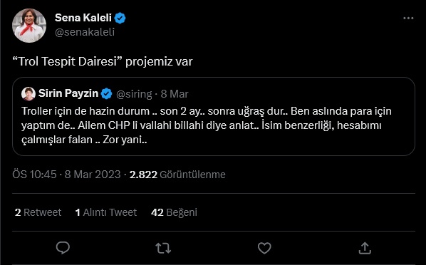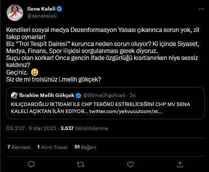 İktidar yandaşı trollerin kamu kaynakları ile finanse edildiği iddia ediliyor. CHP'li Özgür Özel'in geçtiğimiz ay gündeme getirdiği Ebabil Hareketi'ne bağlı trol ordusunun bakanlıklara bağlı kuruluşlar ve birkaç belediye tarafından finanse edildiği söylendi. Trollerin, sosyal medyada yarattığı dezenformasyon ile ilgili paylaşımda bulunan CHP 24. Dönem Milletvekili Sena Kaleli, 'Trol Tespit Dairesi' kuracaklarını duyurdu. Kaleli, trollerinn aldığı tüm maaşların yasal faizi ile geri alınacağını belirterek, "Anayasanın 26. Maddesini ihlalden ve insanların ifade özgürlüklerine saldırı, taciz ve tehditten yargılanmaları yolu açılacak" dedi."SİZ DE Mİ TROLSÜNÜZ MELİH GÖKÇEK"