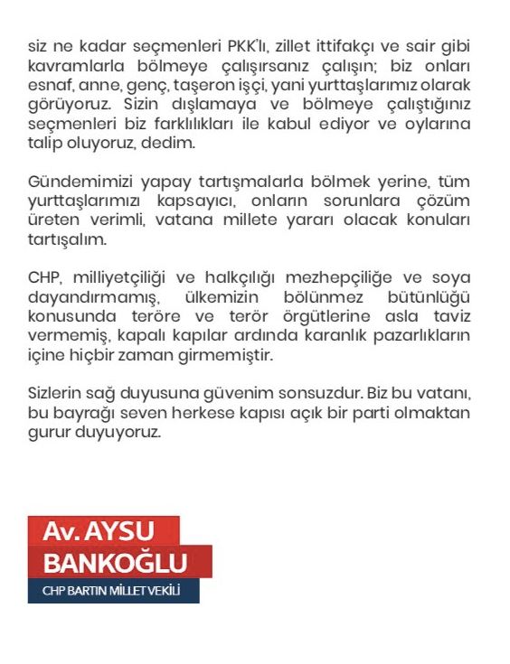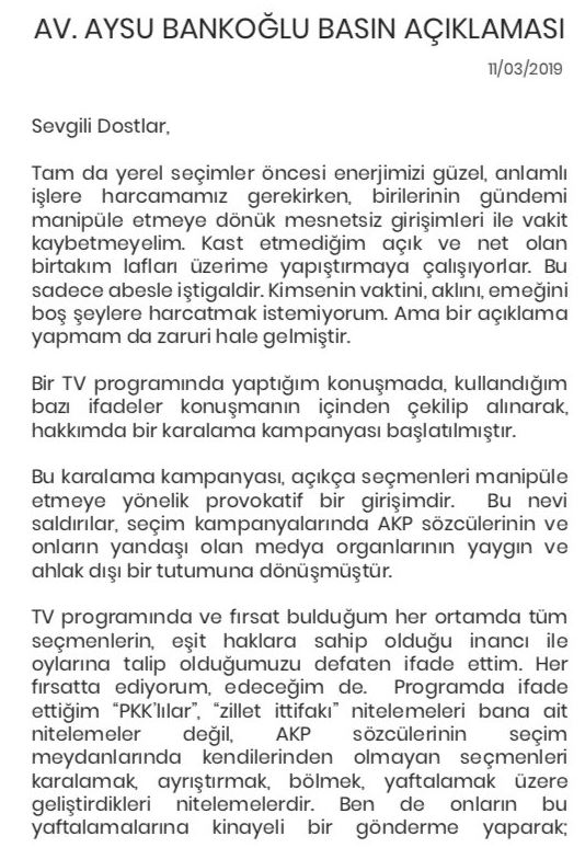 CHP Bartın Milletvekili Aysu Bankoğlu hakkında, 11.03.2019 tarihinde Halk TV isimli televizyon kanalında canlı olarak yayınlanan Siyaset Kültürü isimli programda yaptığı “ PKK’lıdırlar, zillet ittifakı üyesidirler, hiç farketmez...” şeklindeki açıklamaları nedeniyle terör örgütü propagandası yapma , suçu ve suçluyu övme suçlarından resen soruşturma başlatılmıştır.